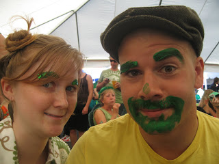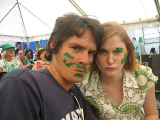 Today, St. Paddy’s day was good fun. We went to street festival from about 3-8 and listened to some live music, danced a bunch, and got our faces painted by these fun girls at the table next to us. As you may be able to see from the picture, she painted my eyebrows green. I felt like all my facial expressions needed to be exaggerated because my eyebrows were so over done. You can probably see this in some of the pictures. None of the boys wore any green so she painted their faces in total. That's Falenczykowski on the left and Charlie on the right.